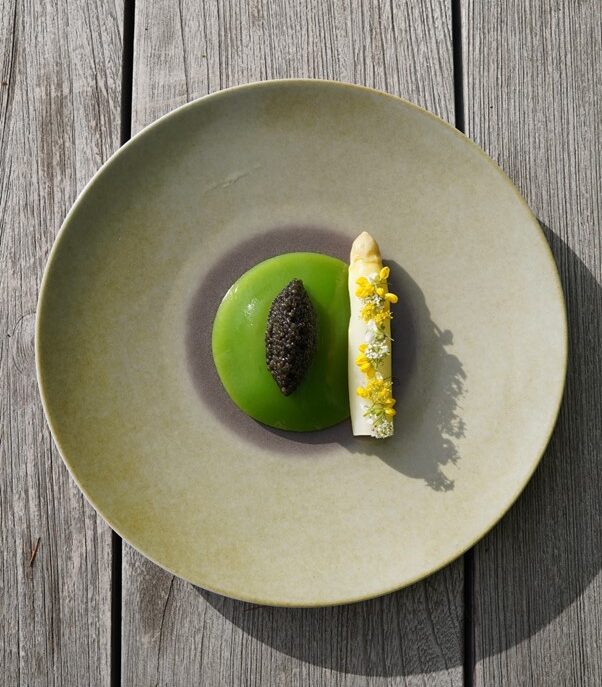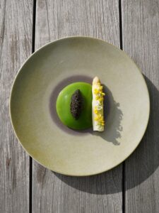 Asparago di Provenza, Caviale Calvisius Siberian, tuorlo morbido e gel di piselli freschi Nicolas Sintes